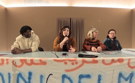 Solidarietà con tutti gli sfollati 18 Marzo 2026 Annalisa Camilli (giornalista di Internazionale), Amara Sacko, Ona Shuhui Ouyang (entrambi proprietari di appartamenti nel grattacielo) e Carola Peverati (Cittadini del Mondo) durante il dibattito pu…