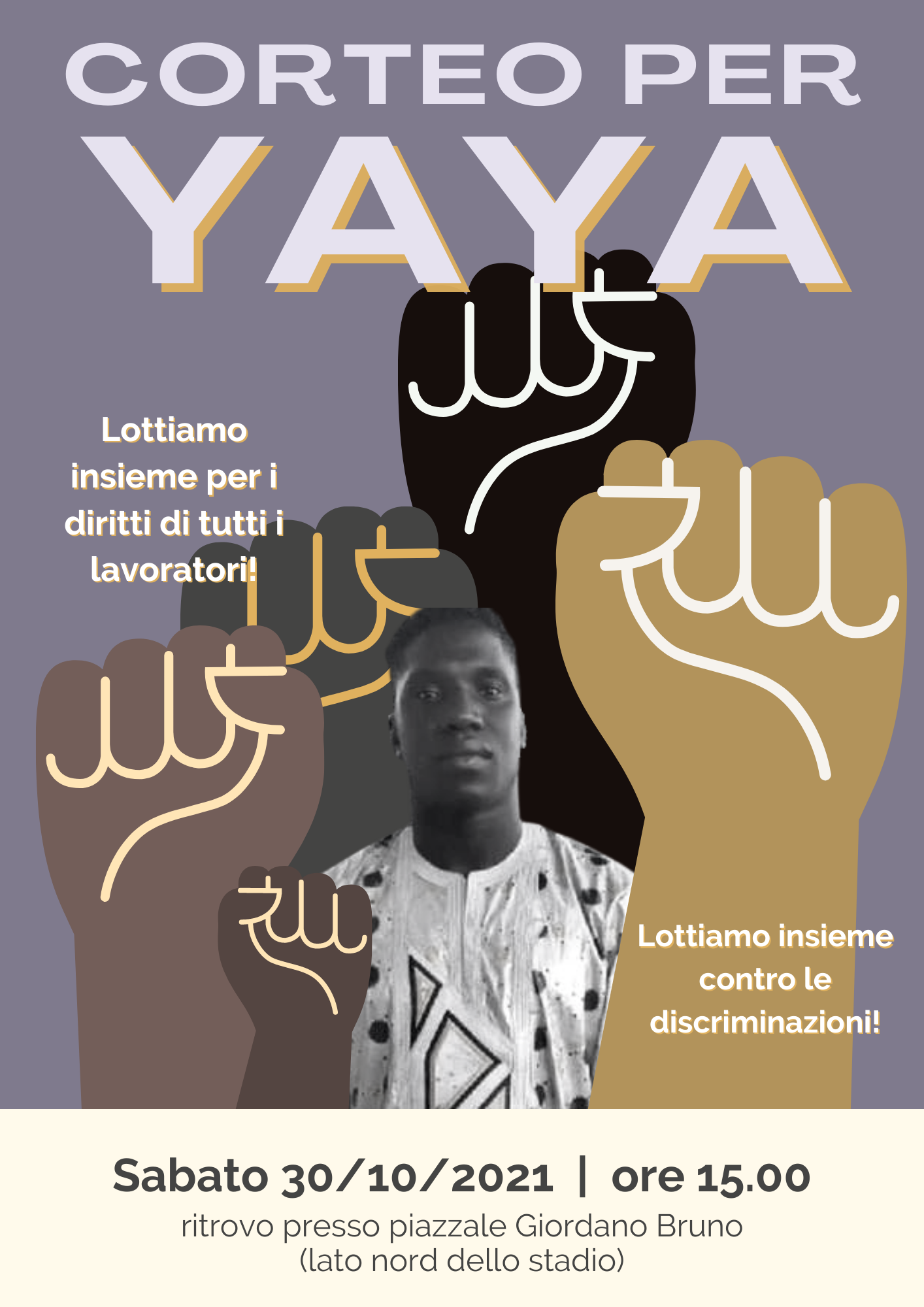 Gli amici di Yaya, la comunità africana della nostra città, l'Associazione Cittadini del Mondo vi invitano a partecipare a questa manifestazione per ricordare il loro caro amico e per protestare contro le condizioni disumane di lavoro e contro le discriminazioni nella nostra Italia.