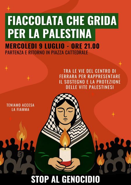 FIACCOLATA CHE GRIDA PER LA PALESTINA 05 Luglio 2025 Ferrara alza la voce – contro il genocidio a Gaza! Luogo: Piazza della Cattedrale Data e ora: il 9 luglio alle 21.00 Una fiaccolata per la vita che perdura…