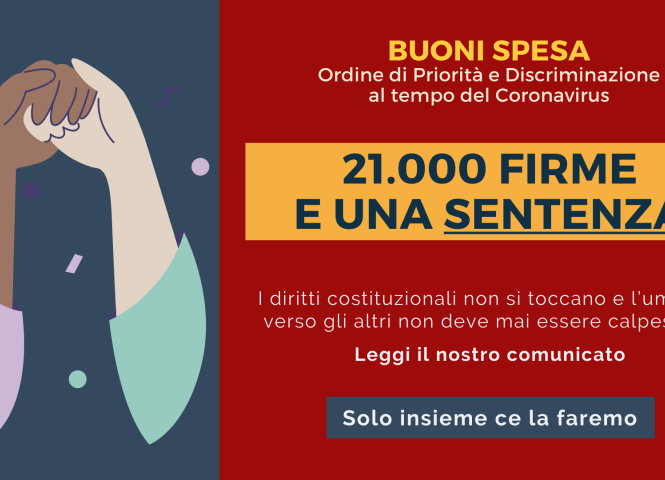 Contro la discriminazione: 21.000 firme e una sentenza 01 Maggio 2020 Abbiamo raccolto 21.000 firme sulla nostra petizione per chiedere al sindaco di Ferrara di stabilire le priorità in base ai bisogni e di cancellare l'iniqua discriminazione basata sulla cittadinanza… Leggi tutto