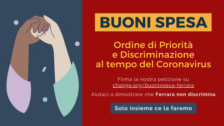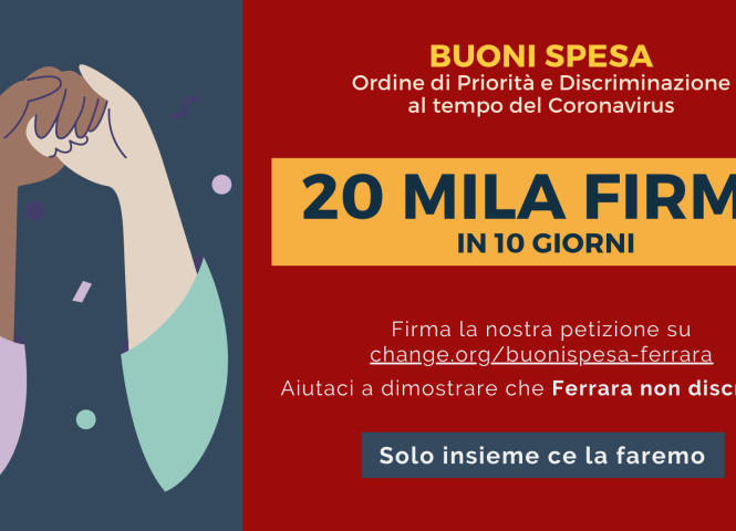 PIU' DI 20 MILA 16 Aprile 2020 La nostra petizione contro le pratiche discriminatorie del Comune di Ferrara nell’erogazione dei buoni spesa durante la crisi del Coronavirus ha raccolto più di 20 mila firme in poco più di una setti… Leggi tutto